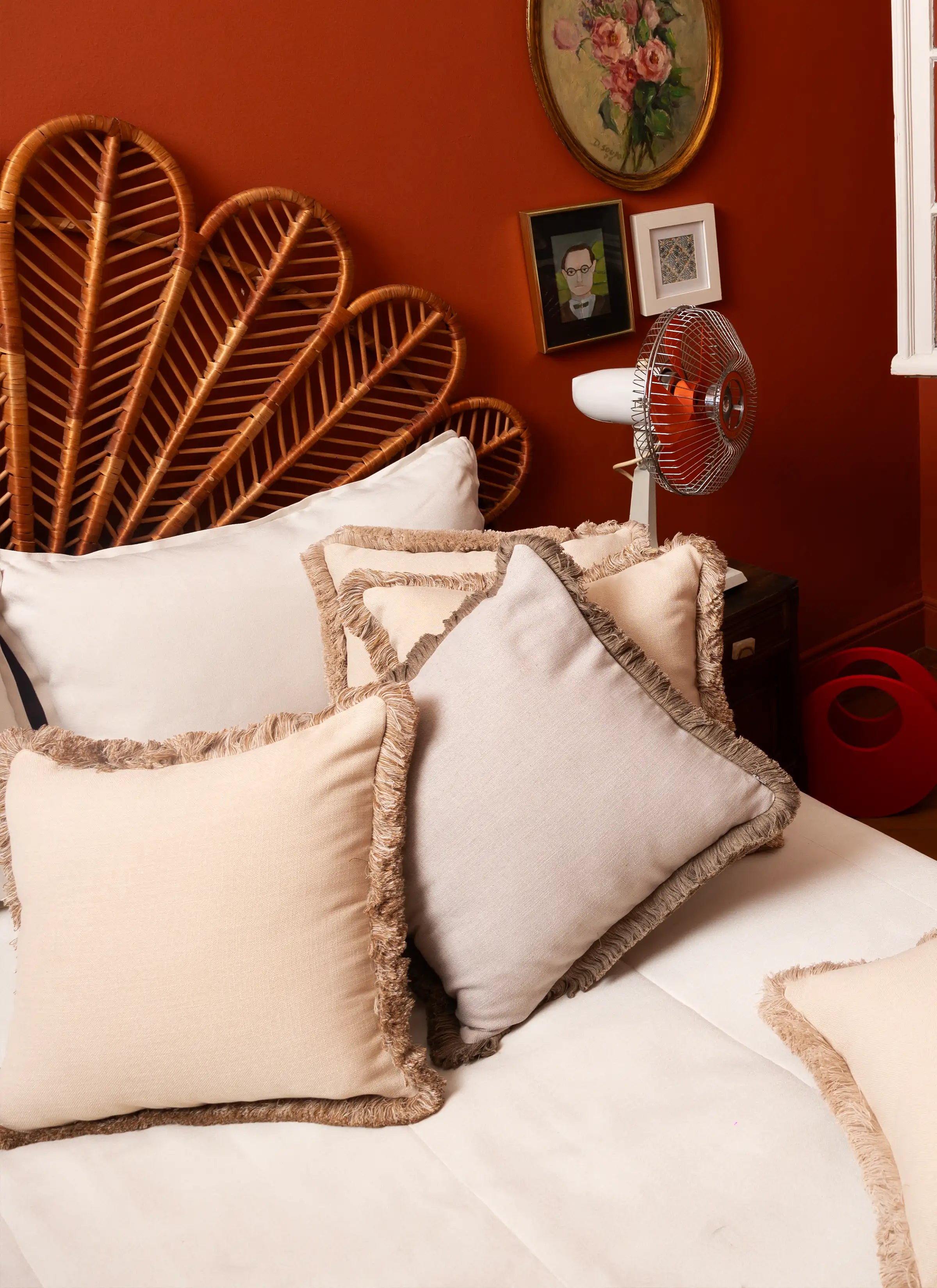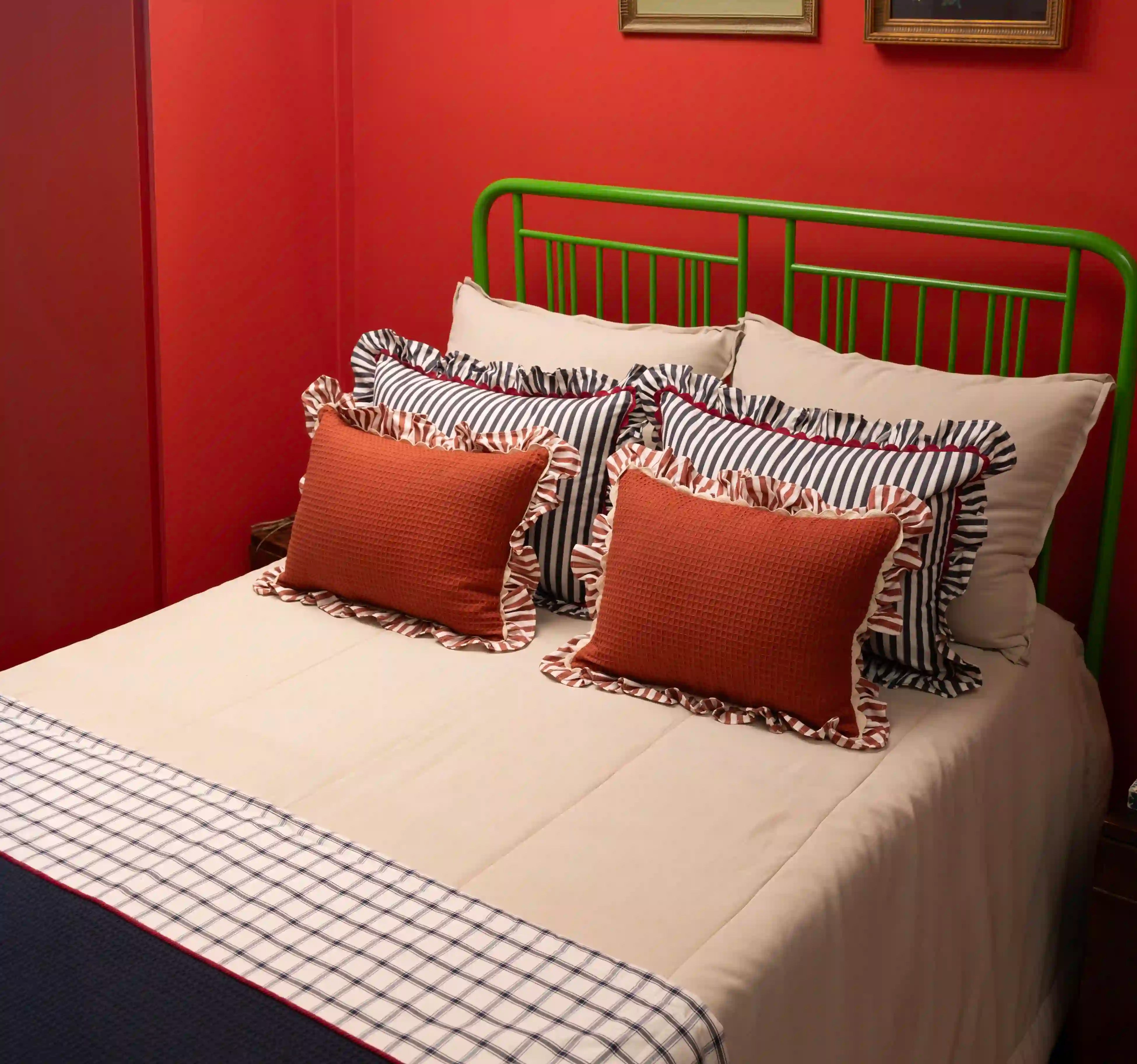 A peseira e os porta-travesseiros atuam juntos para redefinir o espaço — trazendo equilíbrio, presença e uma nova dinâmica para o quarto.
